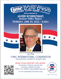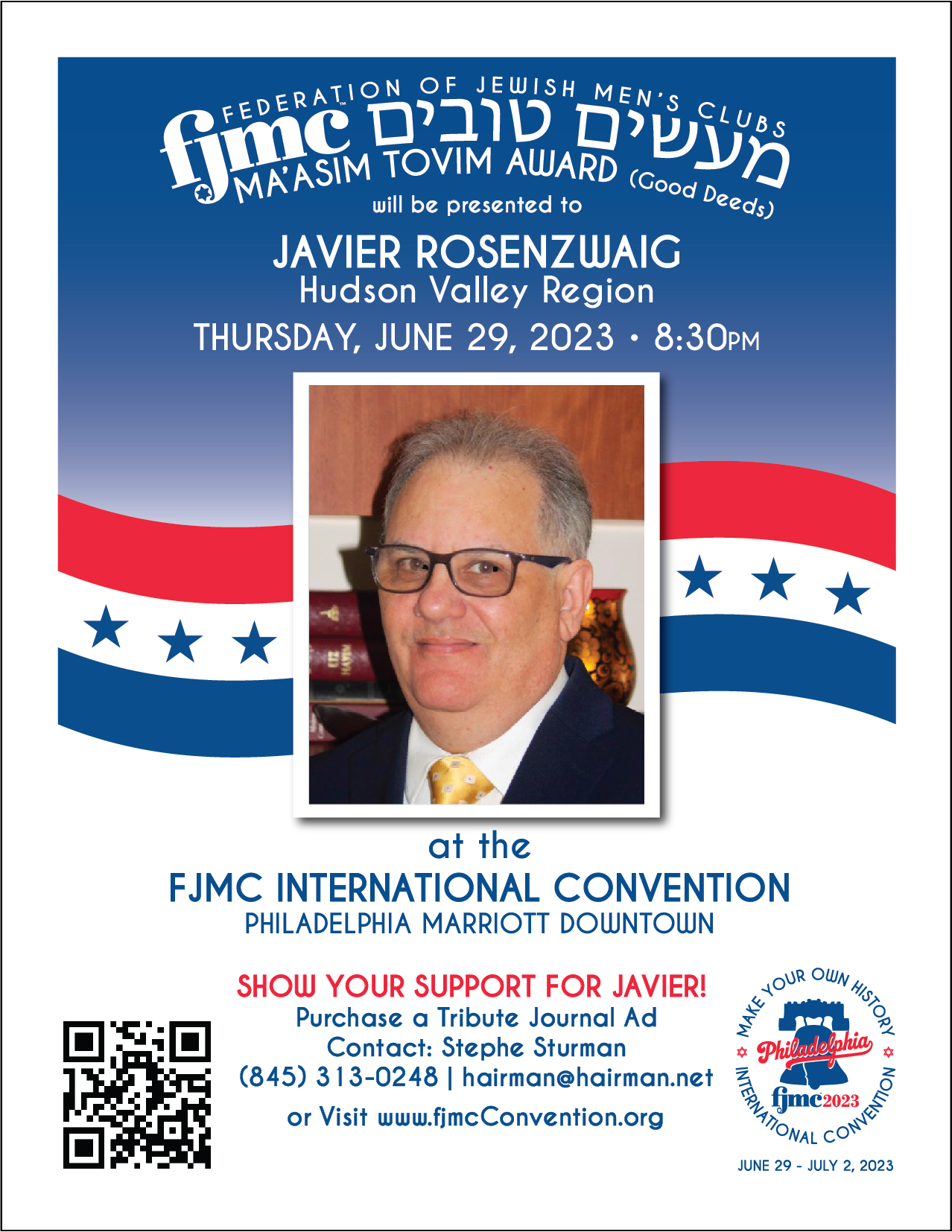 Javier lives in Tappan, New York with his wife, Rebecca, and children, Joshua and Laila. Having attended Jewish day school in Buenos Aires, Argentina, Javier has been committed to Jewish learning, continuity, and community his whole life. Now serving as Secretary of the International FJMC, He previously served as President of the Hudson Valley Region, Co-President of the Men’s Club, VP of Ritual and President of the Nursery School Board at the Orangetown Jewish Center. Professionally, Javier has a Masters degree in electronics engineering, was trained as a bench jeweller and now does IT consulting. For fun. Javier likes to “build stuff”, including high-tech toys and woodworking and works every summer at Ramah Day Camp in Nyack as Master woodworker. |